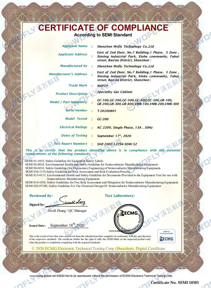 最后,沃飛WOFLY全自動(dòng)特氣柜(GC)擁有SEMI S2認(rèn)證,SEMI S2(Safety Guidelines for Semiconductor Manufacturing Equipment)是針對(duì)半導(dǎo)體制程設(shè)備供貨商所規(guī)范的基本健康和安全要求安全標(biāo)準(zhǔn),代表了半導(dǎo)體廠家的基本安全要求。